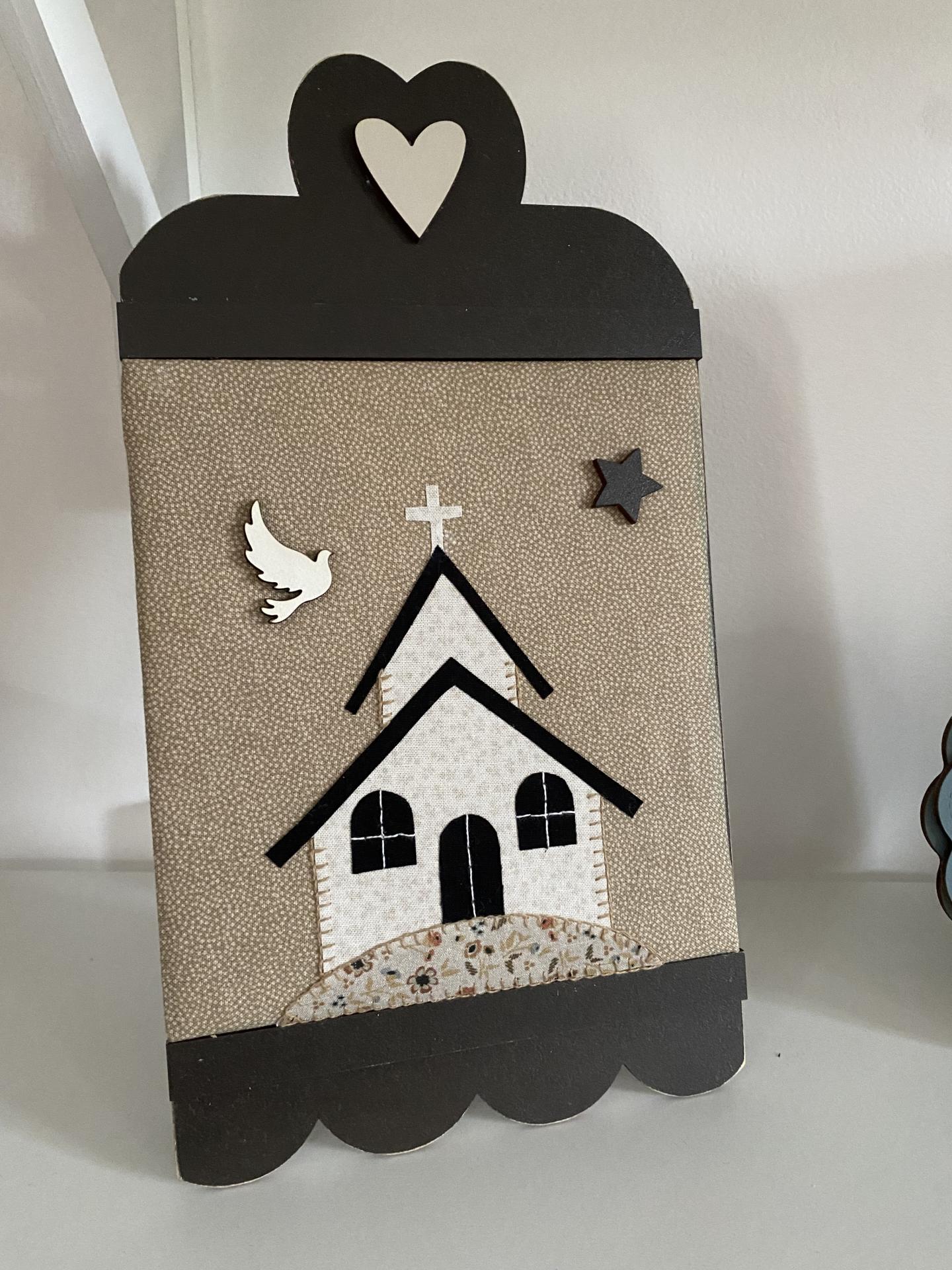 Ce cadre met en valeur une charmante chapelle réalisée en appliqué patchwork, symbole de spiritualité, entourée d'une colombe blanche et d'une étoile brillante, le tout sur un fond texturé en beige. ?